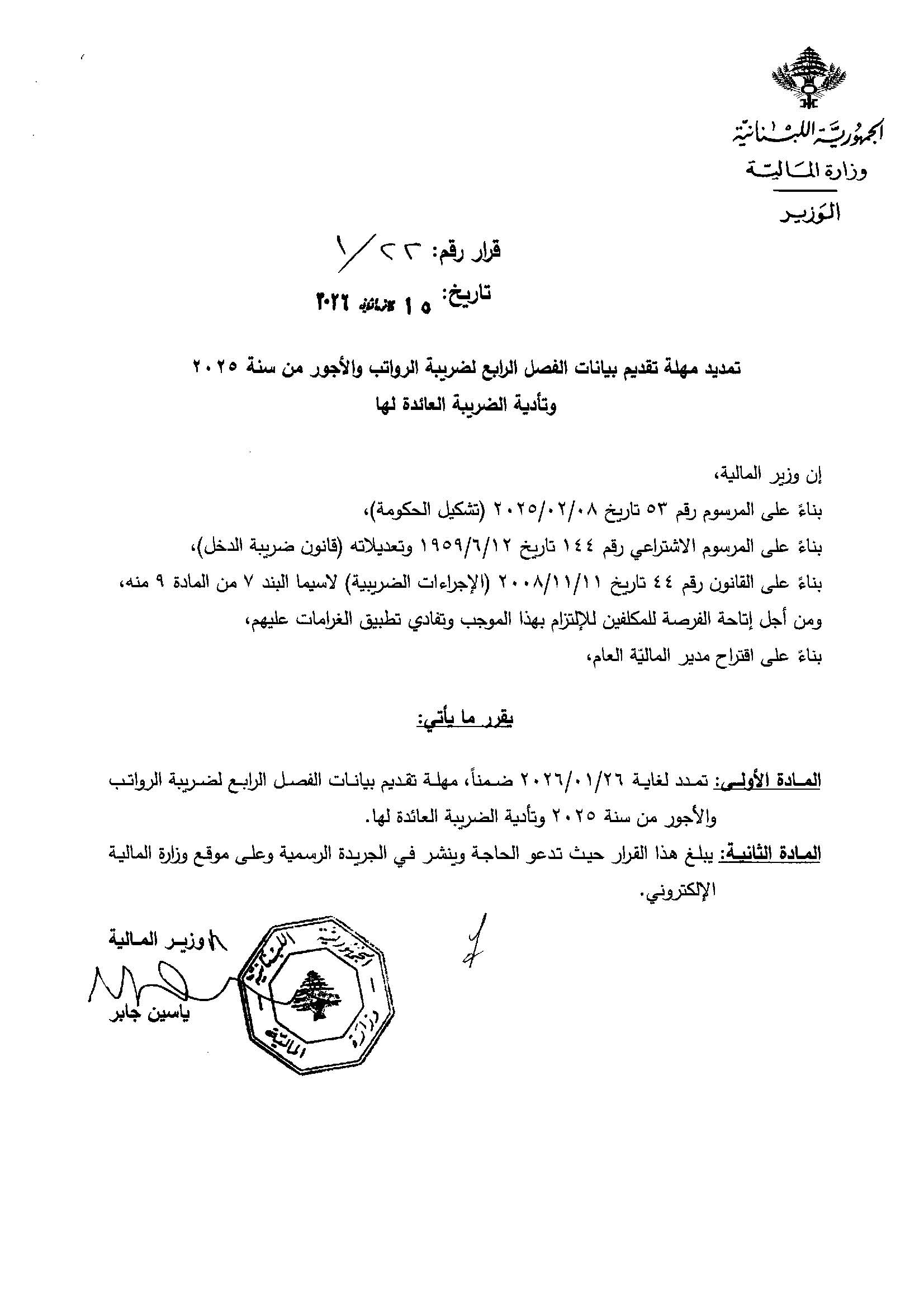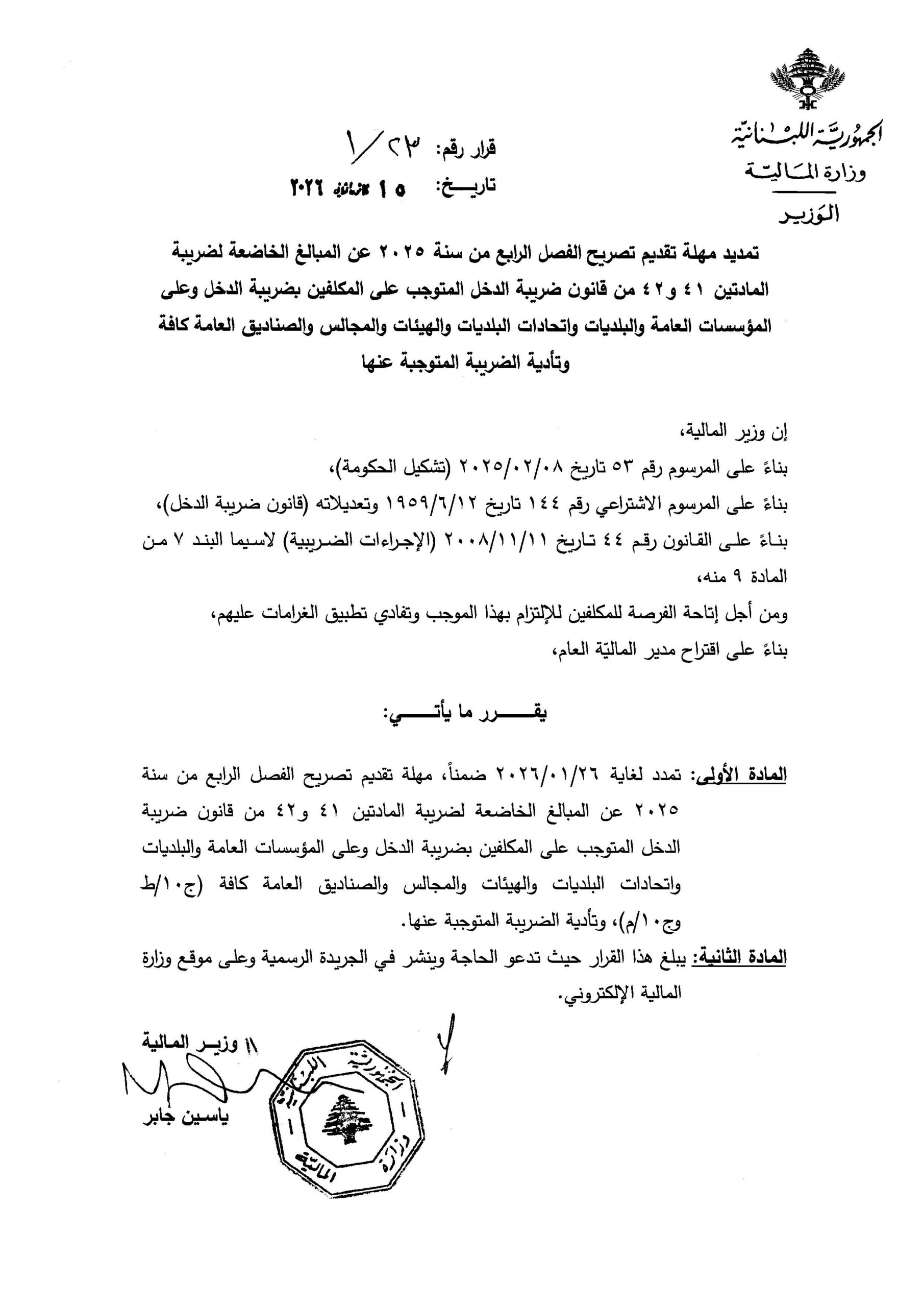 تمديد مهلة تقديم تصريح الفصل الرابع لضريبة الدخل عن سنة 2025