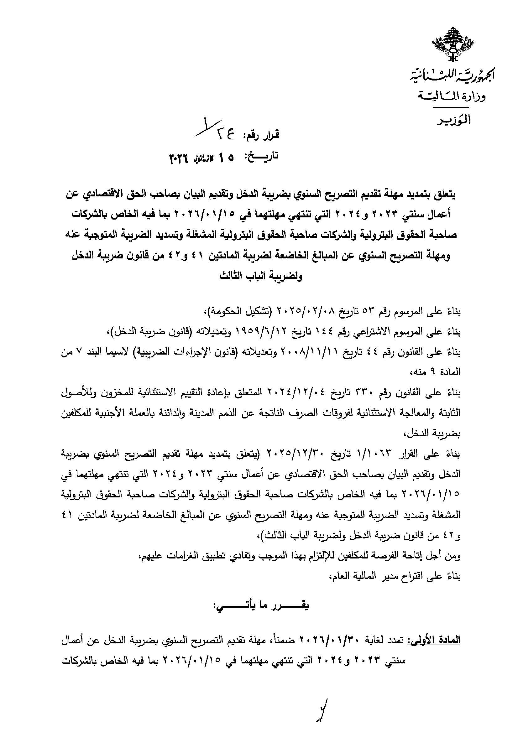 تمديد مهلة تقديم التصريح السنوي لضريبة الدخل عن أعمال سنتي 2023 و2024